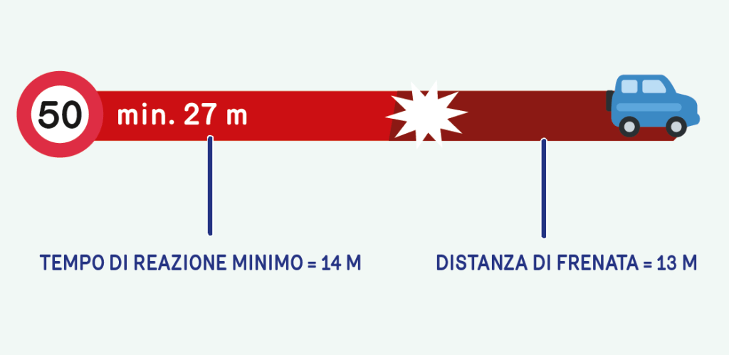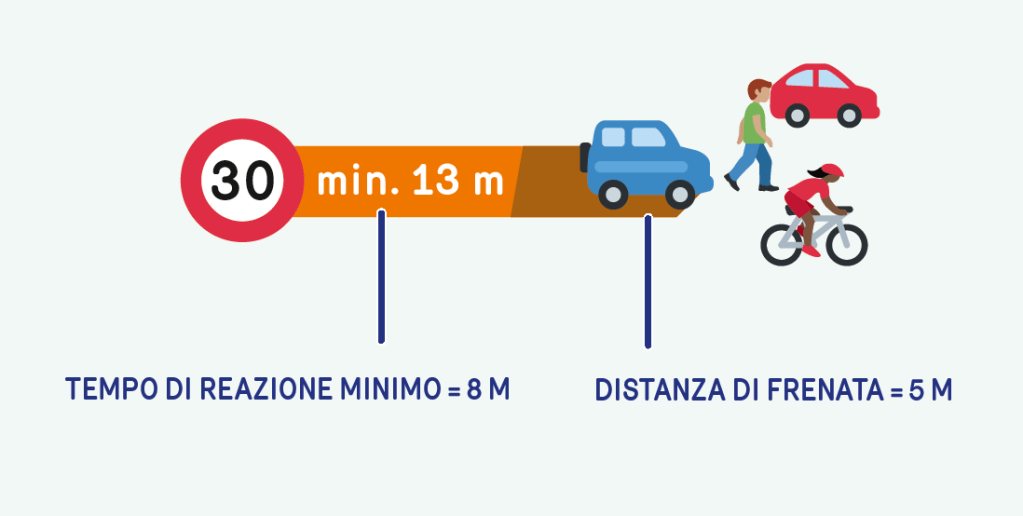 Andare a velocità superiori ai 30 km/h comporta un grande pericolo in caso di frenata di emergenza: una macchina che viaggia a 30 km/h percorre 13,3 metri dal momento della frenata, mentre un’auto che viaggia a 50 km/h percorre un totale di quasi 28 metri dall’inizio della frenata al completo arresto, il doppio rispetto ad un mezzo che viaggia ai 30 km/h.