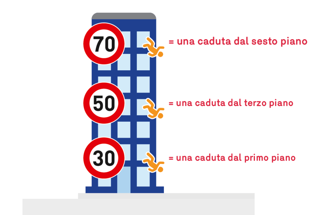In caso di incidente all’aumentare la velocità del veicolo aumenta anche il rischio di conseguenze gravissime o fatali per le persone coinvolte.
