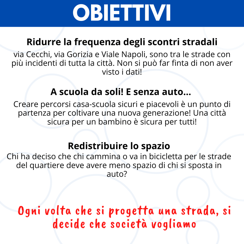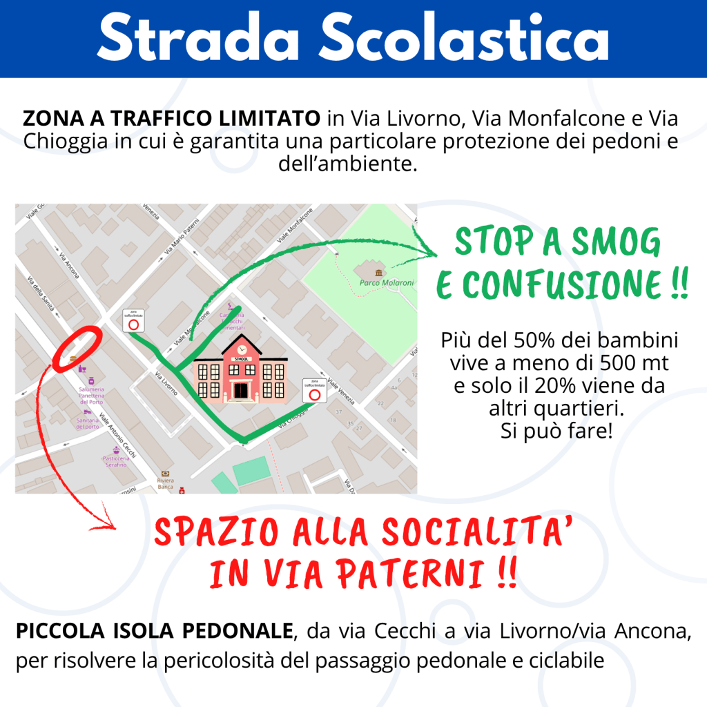 Ad inizio 2025 sono stati fatti una serie di incontri con il Consiglio di Quartiere n. 11 Porto-Mare, per analizzare insieme le priorità di intervento rispetto a sicurezza stradale e vivibilità a cui sono collegate benessere e buon vivere quotidiano. Sono state analizzate e studiate anche le alternative e gli strumenti esistenti, già realizzati in altri contesti urbani, italiani ed europei. A febbraio 2025 una prima proposta progettuale è stata presentata insieme al Consiglio di Quartiere all’amministrazione comunale.